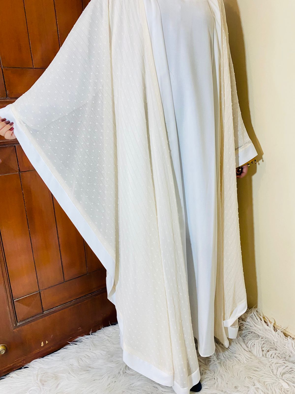 Discover effortless sophistication with our Cream Baggy Abaya crafted from premium self-georgette fabric. Known for its soft texture and lightweight feel, this abaya drapes beautifully, offering a relaxed and modest silhouette that suits all body types.